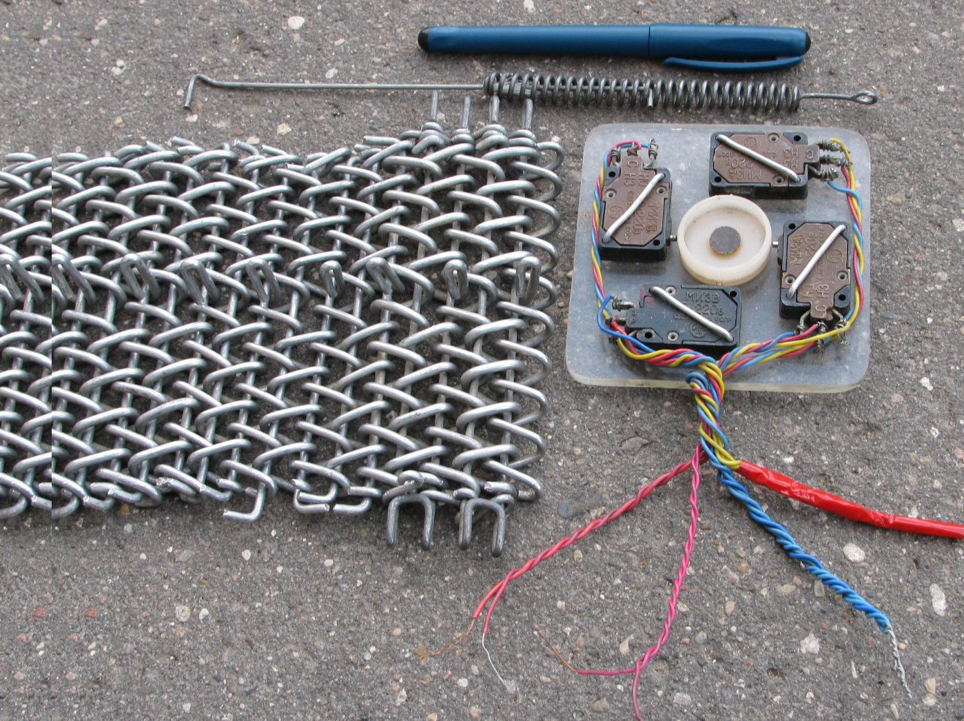 На фото (фото сверху) F9 изготовленная для модели танка длиной 1м полнофункциональная гусеница с центральным упором трака сдвоенных колес. Четные траки гусеницы имеют правый шаг (по часовой стрелке) спиральной проволочной намотки трака на оправку (стальная закругленная пластина). Нечетные траки наоборот левый шаг (против часовой стрелки) спиральной намотки трака. Расстояние между траками поддерживается отдельными плоскими проволочными алюминиевыми тягами на концах траков. Оси гусеницы – стальная проволока. Справа на фото F9 4-командный плоский джойстик: изготавливается за 20 минут. Вся электромощность на моторах модели проходит через контакты переключателей плоского джойстика F9. Для особо мощных моделей надо поднять напряжение электропитания модели. Переключатели крепят алюминиевыми скрепками в отверстия на квадратике из оргстекла или скользкой пластмассы. Шашка с углублением для большого пальца руки крепится электротехническим винтом с выровненной напильником верхней частью. Снизу под квадратиком из оргстекла винт с шашкой фиксирует от перемещения вверх кольцевая пластинка диаметром чуть меньше шашки. Кольцевую пластинку удерживает на винте кольцо из толстой алюминиевой проволоки. Кольцо из толстой алюминиевой проволоки одевается на выточку-паз (делается напильником или надфилем) в винте, зажимается плоскогубцами. Перемещая большим пальцем шашку вправо-влево моделист управляет поворотами модели автомобиля, колёсного или шагающего робота, танка, других моделей. Перемещая большим пальцем шашку вперед-назад моделист управляет разгоном и торможением модели автомобиля, колёсного или шагающего робота, танка, других моделей. Удерживается в руке плоский джойстик F9 остальными пальцами той же кисти руки. Если добавить ещё 2 переключателя с шарнирной ручкой возможно в принципе 3D-управление авиамоделью. Хотя конечно выгоднее заменить переключатели на 3 переменных резистора, ещё лучше на 6 тензодатчиков пропорционального управления авиамоделью. Ручку джойстика для управления авиамоделями лучше крепить в локтевой раме: надевается через пружинные или резиновые зажимы на нижнюю часть локтя. Для управления авиамоделью достаточно 1 руки. Можно двумя руками управлять двумя авиамоделями, если мозг не задымится. Сверху на фото F9 работающий проволочный аналог ходового винта и гидроцилиндра. Этот проволочный ходовой винт работает в электроусилителе руля модели автомобиля на F4 и F5. Где он соединен последовательно с проволочной червячной передачей. Они совместно обеспечивают электроусилителю руля передаточное число 1750. Для поворота переднего колеса по его вертикальной оси поворота на 34° нужно 165 оборотов электромотора электроусилителя руля. 1750 - мировой рекорд передаточного числа не только для моделей автомобилей, но и для любых автомобилей вообще.