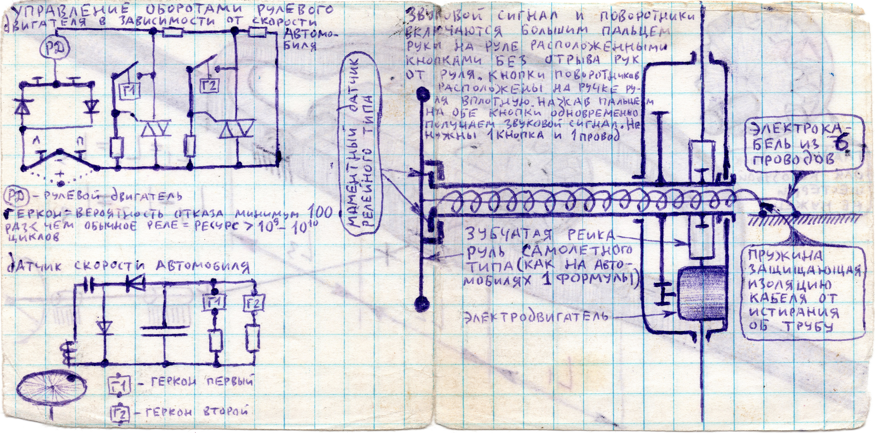 1992г: это (над текстом) мультиплекс диодный бортсети полнофункциональной модели автомобиля с механизированным, по движениям шашки джойстика, управлением включения поворотника левого переднего - ПЛП, поворотника правого переднего – ППП, фар – Ф, поворотника левого заднего – ПЛЗ, поворотника правого заднего – ППЗ, фары заднего хода – ФЗХ. П – поворачивающий колеса двигатель электроусилителя руля. К1, К2 – конечные выключатели левого, правого поворота руля электроусилителем руля. ДЛ – двигатель левый задний, вращает левое заднее ведущее колесо автомобиля. ДП – двигатель правый задний, вращает правое заднее ведущее колесо автомобиля.