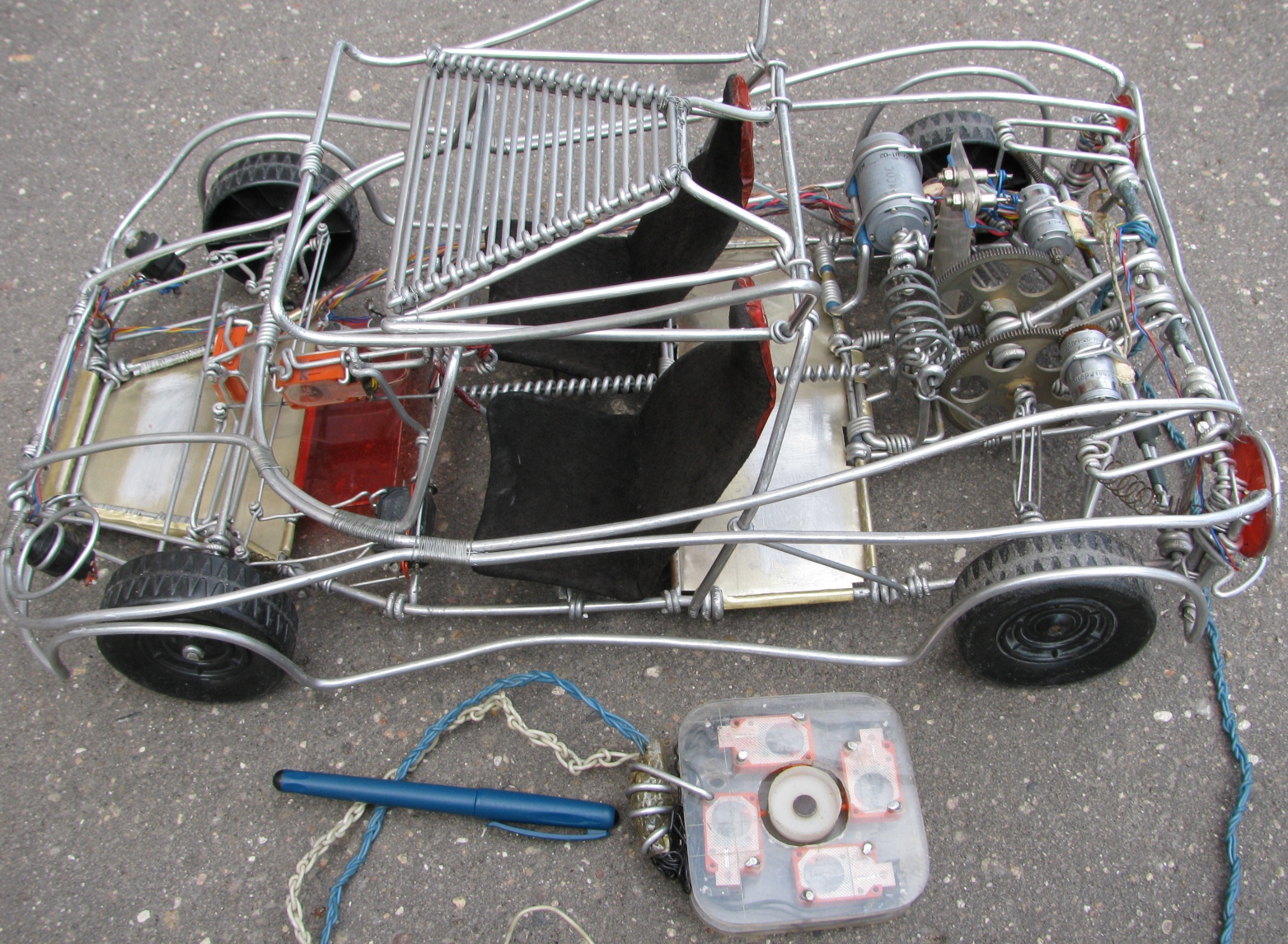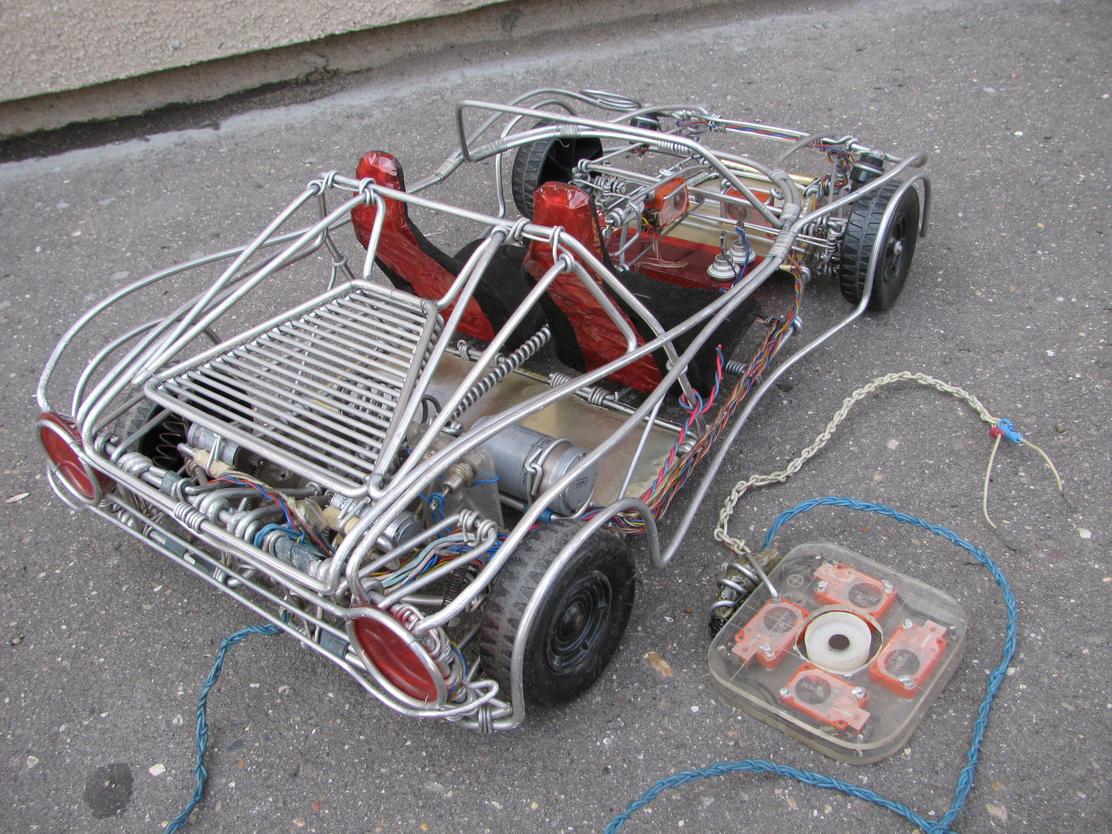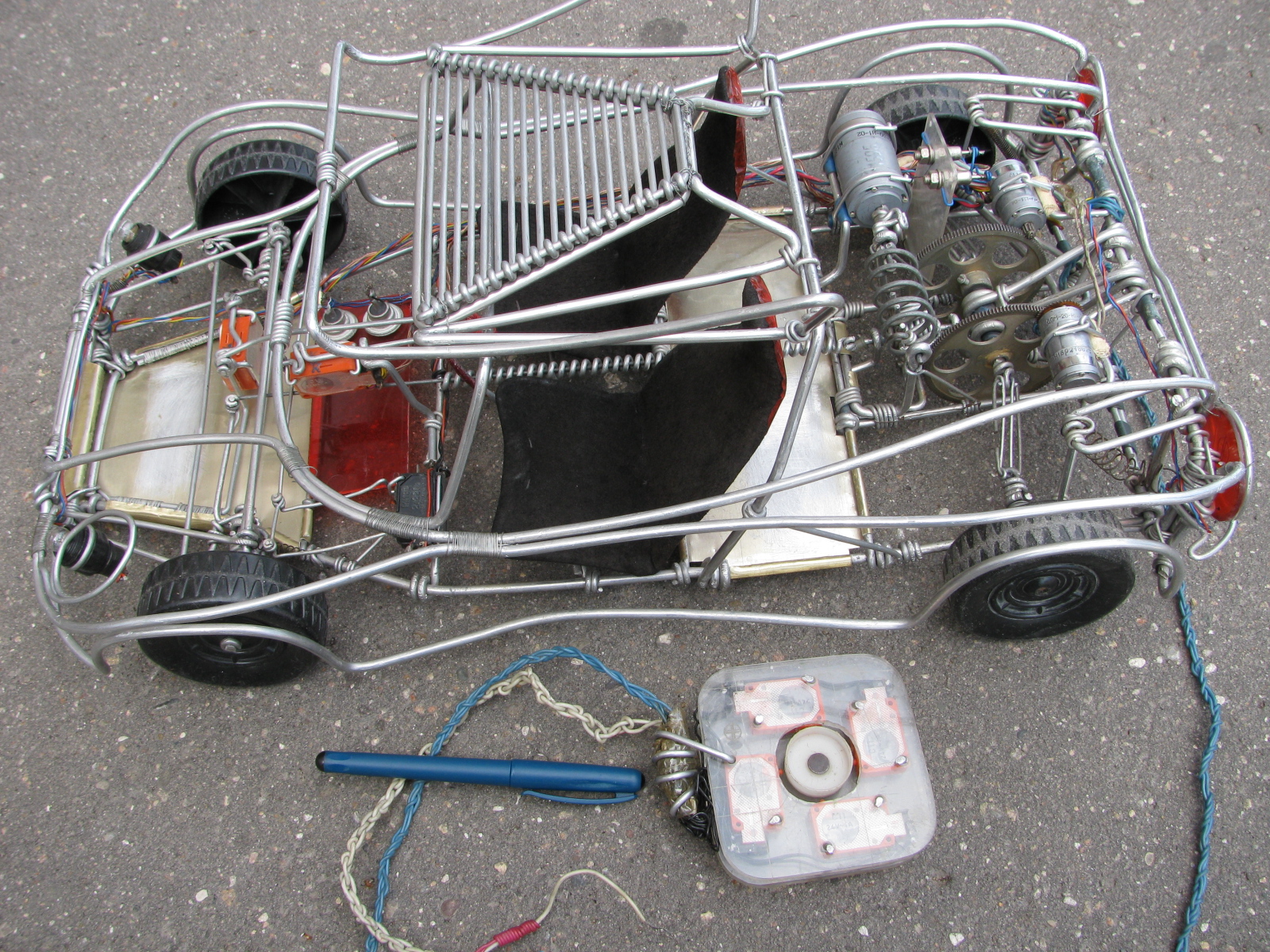 Записываю заново удаленный спецслужбами технический текст к этому фото (над текстом): это проволочная модель автомобиля с независимой подвеской всех колес, с электроусилителем руля, с работающим (все повороты + газ + тормоз + лампы поворотников + лампа заднего хода автоматически включаемая при заднем ходе автомобиля) джойстиком (внутри автомобиля) + плоский работающий (все повороты + газ + тормоз + лампы поворотников + лампа заднего хода автоматически включаемая при заднем ходе автомобиля) плоский джойстик (правый нижний угол фото F4). Эта модель автомобиля имеет электроусилитель руля с передаточным числом 1750 + диодный мультиплекс всей электрической схемы автомобиля.